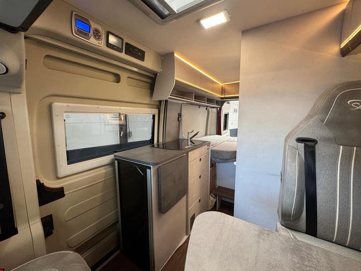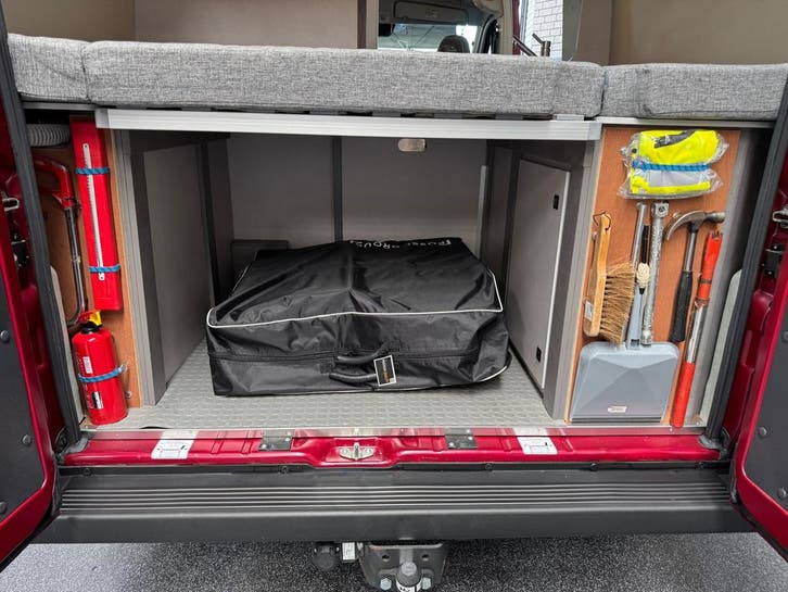 2 pits gasfornuisDwarsbed (2 personen)Eethoek/ZithoekKoelkast met diepvriezerLavabo/DoucheOpbergruimte onder het bedPilootstoelenSpoelbakVaste WC