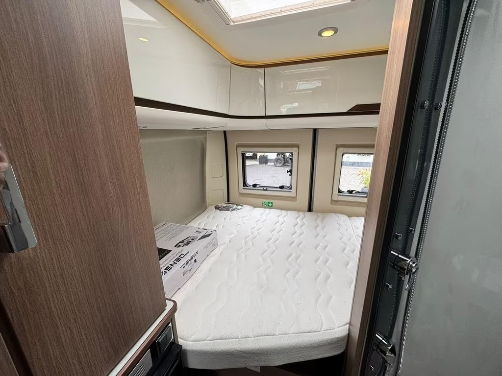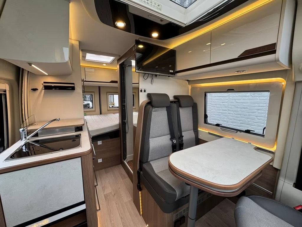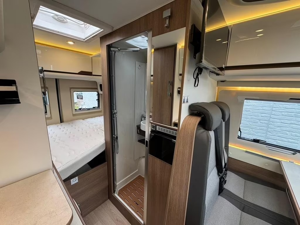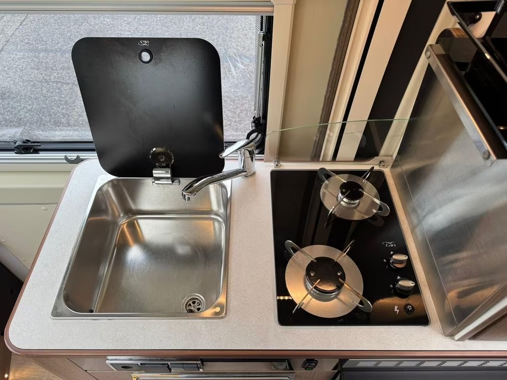 2 pits gasfornuisDwarsbed (2 personen)Eethoek/ZithoekKoelkast met diepvriezerLavabo/DoucheOpbergruimte onder het bedPilootstoelenSpoelbakVaste WC