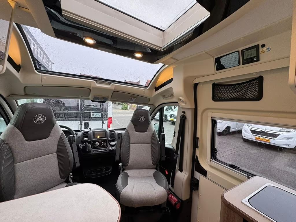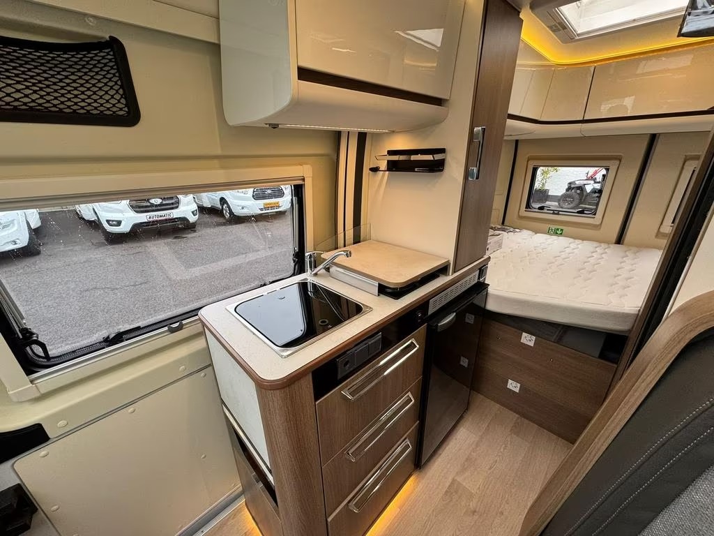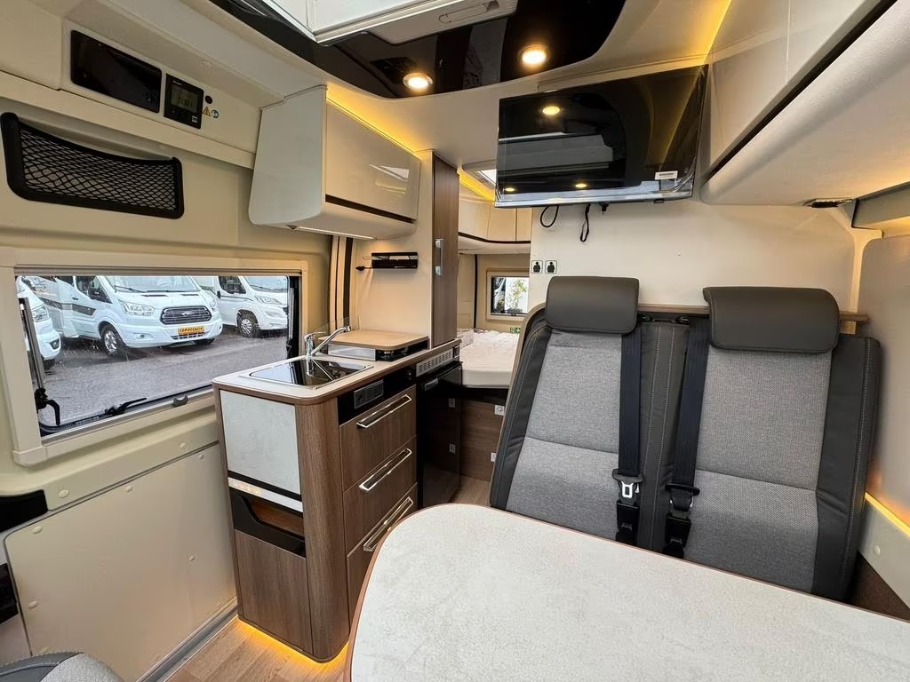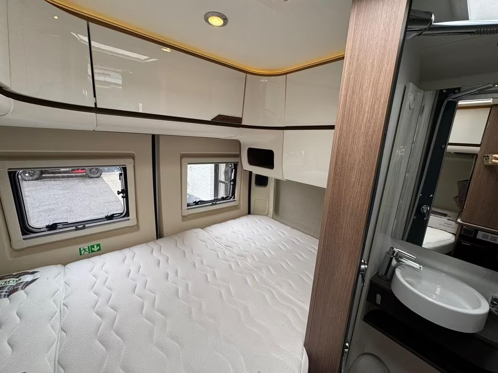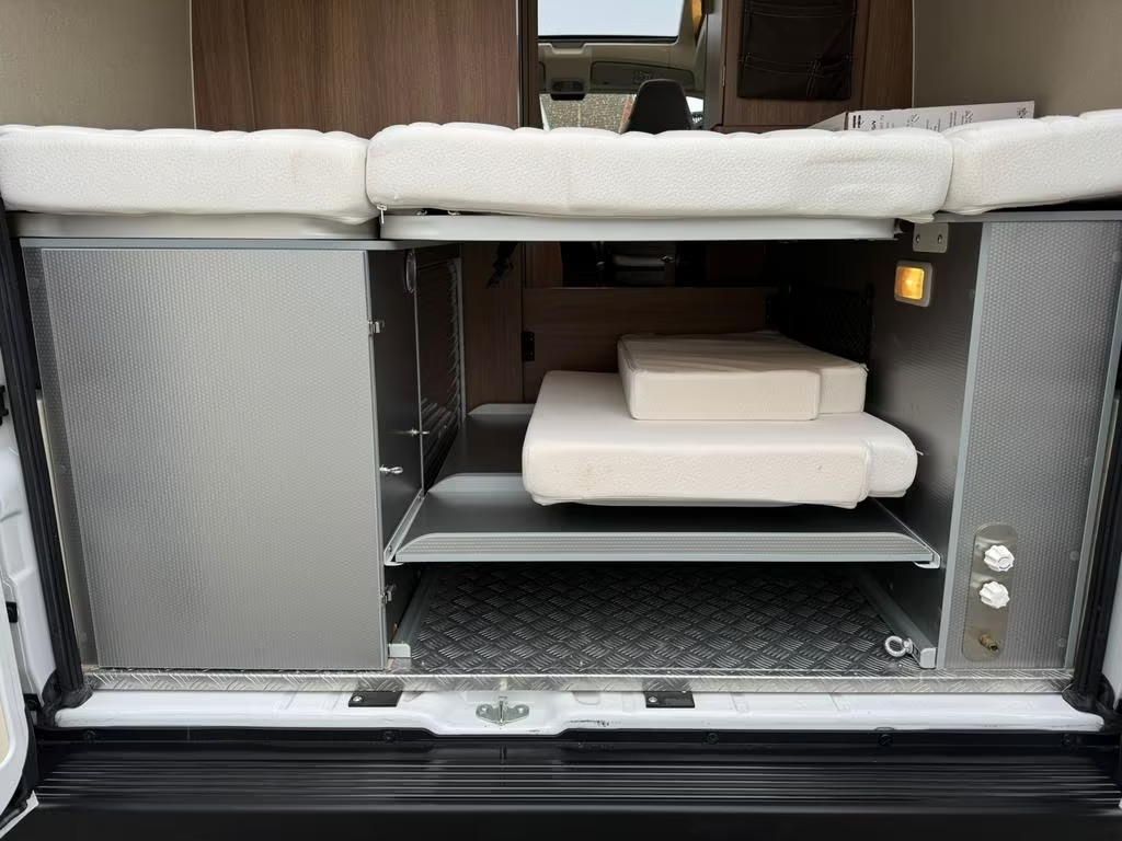 2 pits gasfornuisDwarsbed (2 personen)Eethoek/ZithoekKoelkast met diepvriezerLavabo/DoucheOpbergruimte onder het bedPilootstoelenSpoelbakVaste WC