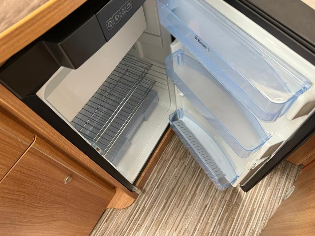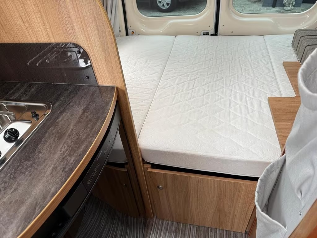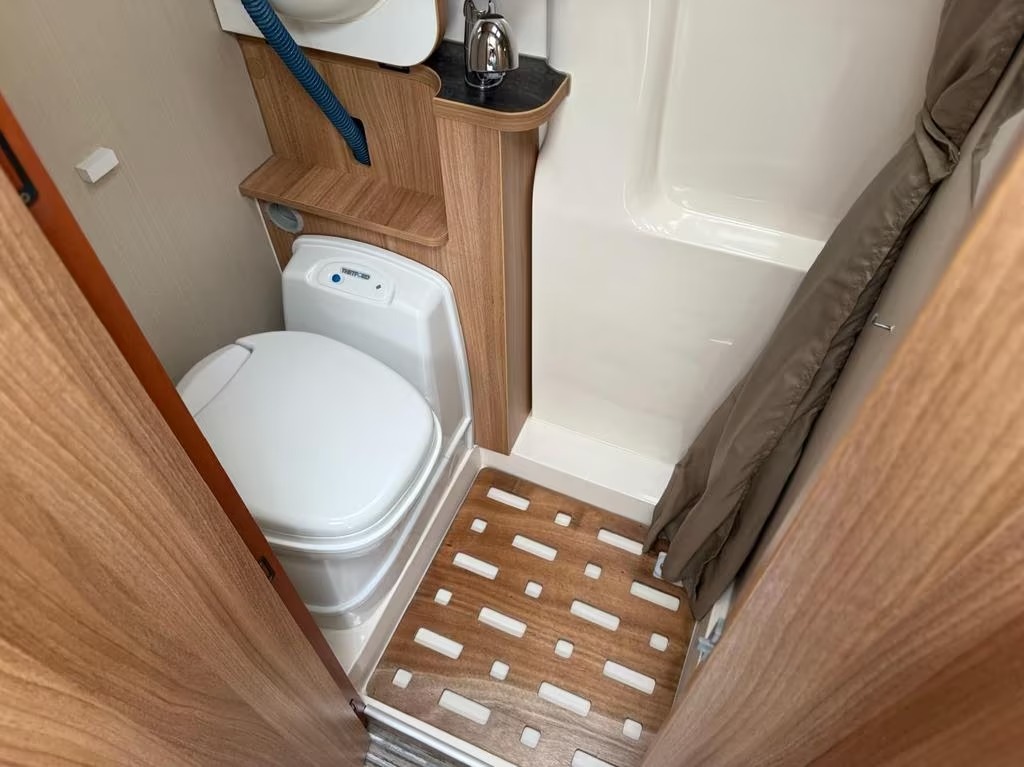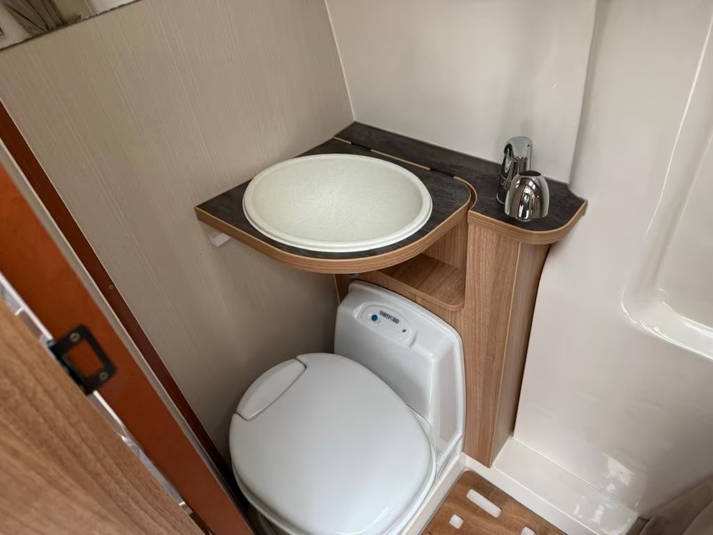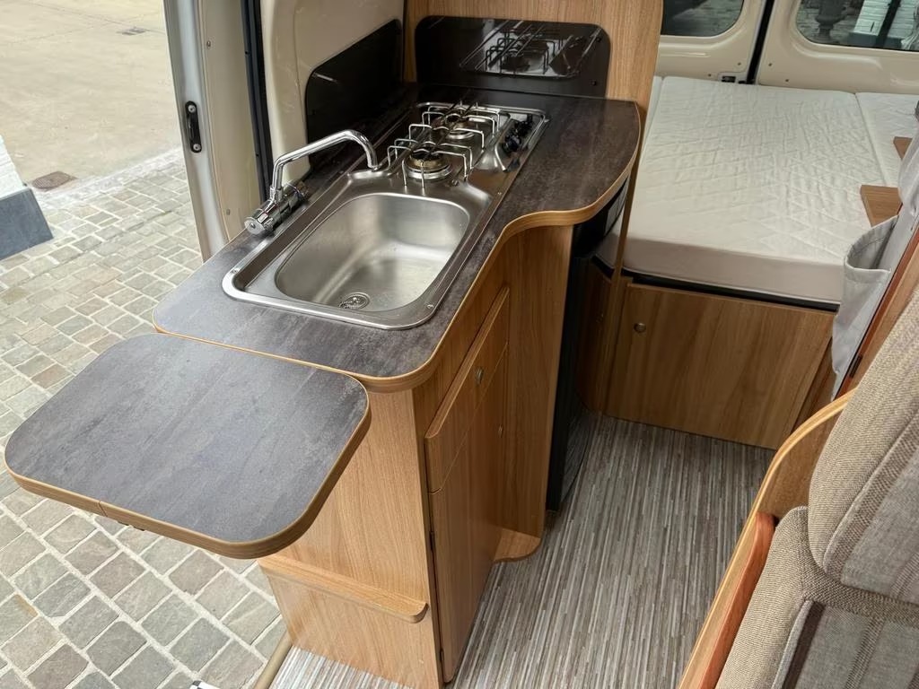 2 pits gasfornuisDwarsbed (2 personen)Eethoek/ZithoekKoelkast met diepvriezerLavabo/DoucheOpbergruimte onder het bedPilootstoelenSpoelbakVaste WC